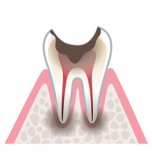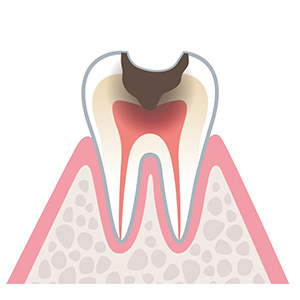 エナメル質、象牙質を溶かし、歯の神経(歯髄と言います)にまで、虫歯が達した状態です。このまま虫歯の影響が神経まで感染してしまうと炎症(歯髄炎)引き起こし、歯がひどく痛みはじめます。 歯の根(神経)の先まで炎症が進んだのち、根の先端から外へ炎症が及ぶと、膿が出る場合もあります。歯の神経を抜いて、虫歯菌除去を行い、薬剤を詰める処置(根管治療)が必要になります。最後に治療箇所に被せ物をして、噛める状態にします。