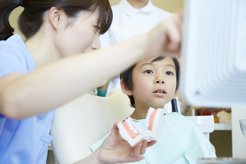 小児歯科では、乳歯の虫歯治療やフッ素塗布、はみがき指導などを行います。