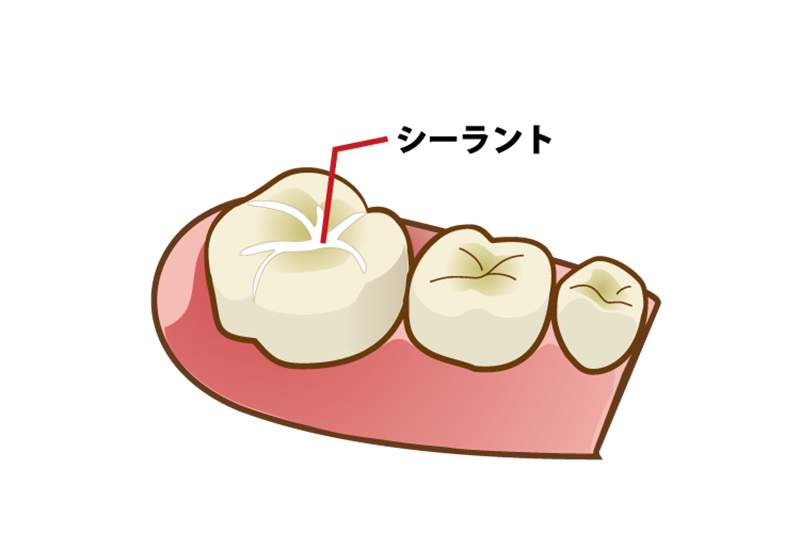 6歳臼歯や乳歯の奥歯など複雑な形の歯には汚れなどが溜りやすい可能性があります。そこでフッ素加を掛け合わせた樹脂(シーラント)を歯の溝に投入し、虫歯予防を行っています。